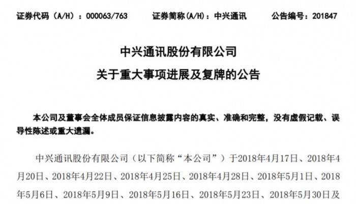 6月12日晚間,中興通訊發(fā)布公告稱,該公司A股將于2018年6月13日上午開市起復(fù)牌。
